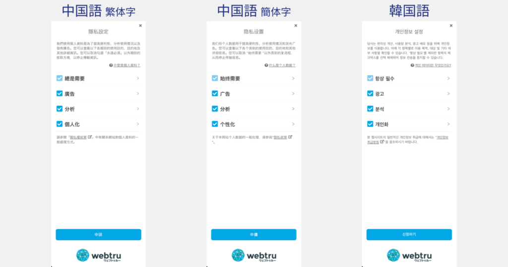 webtru ニュース一覧 機能アップデート一覧 同意管理ツール「webtru(ウェブトゥルー)」が、中国語と韓国語に対応 2024年8月9日 機能アップデート 同意管理ツール「webtru(ウェブトゥルー)」が、中国語と韓国語に対応 DataSignが提供する同意管理ツール「webtru(ウェブトゥルー)」が、中国語(繁体字・簡体字)と韓国語に対応したことをお知らせします。 webtruウィジェットの対応言語は、従来から対応していた言語を含めると、以下になります。 日本語 英語 ドイツ語 フランス語 中国語(繁体字・簡体字) 韓国語 ニュース一覧へ戻る 最新の規制対応を「webtru」で簡単に。 CMPツール「webtru」や、GDPR・外部送信規律への対応についてお悩みの方はお気軽にご相談ください。無料でダウンロードできるサービス資料もご用意しています。 まずは無料相談 資料ダウンロード